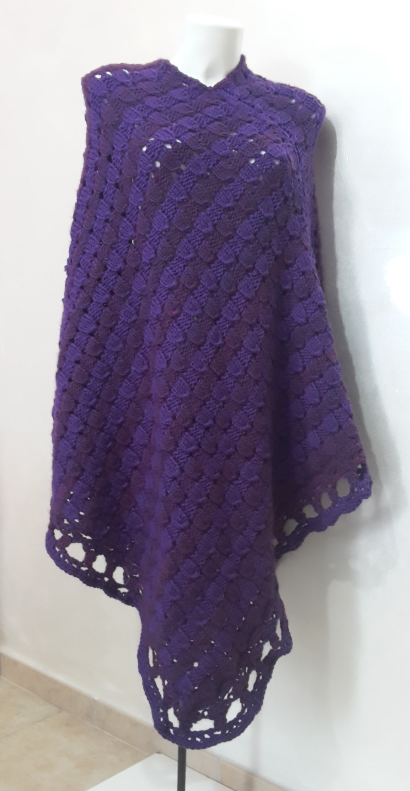 poncho in lana realizzato a mano, lavorato a punto dama traforato. filati Mondial. taglia XL e a richiesta anche in altre taglie colori e filati.